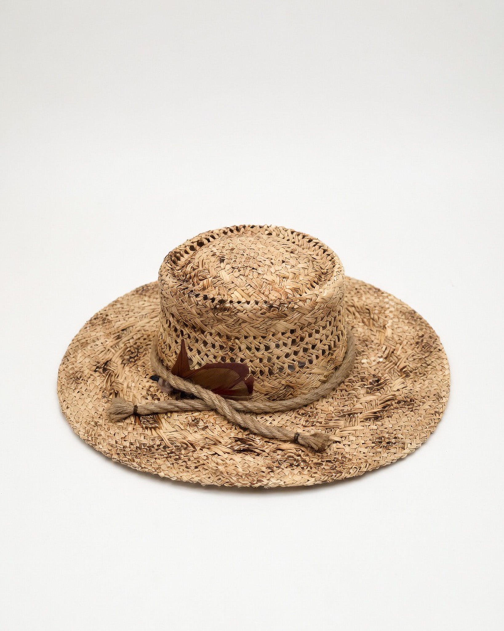 Chapéu artesanal em rafia natural, leve e altamente respirável. Forma cilindríca trançada com acabamento aberto, aba ampla para proteção solar. Fita decorativa em corda rústica trançada à mão, com franjas e pena natural em tons terra para um toque boho autêntico. Estilo fedora boho / Panama.