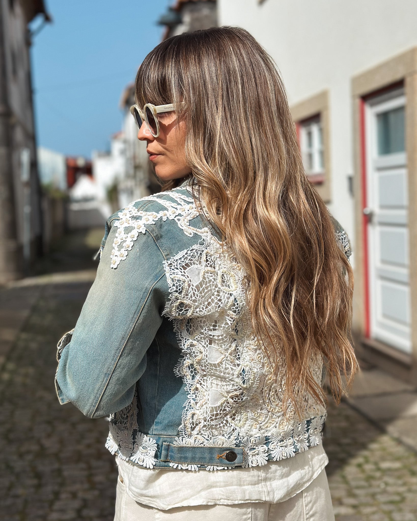 Blusão de ganga clara, com aplicações de renda e missangas. Contém 2 bolsos frontais. Costas em renda transparente.