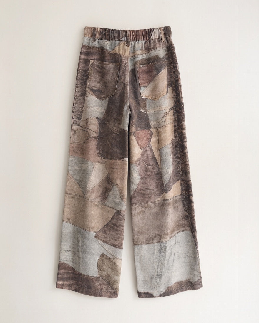 Calças wide-leg, com estampado abstrato com formas geométricas sobrepostas em tons terra com textura envelhecida. Cintura alta com cós plissado a frente e elástico atrás, fecho de botão, bolsos laterais e traseiros clássicos.