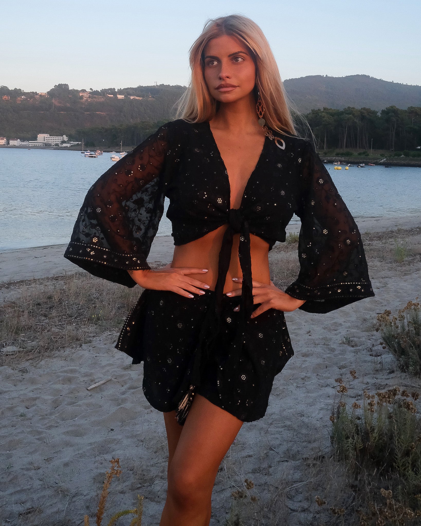 Calções tule com latejoulas no tom preto. Contém elástico na cintura.