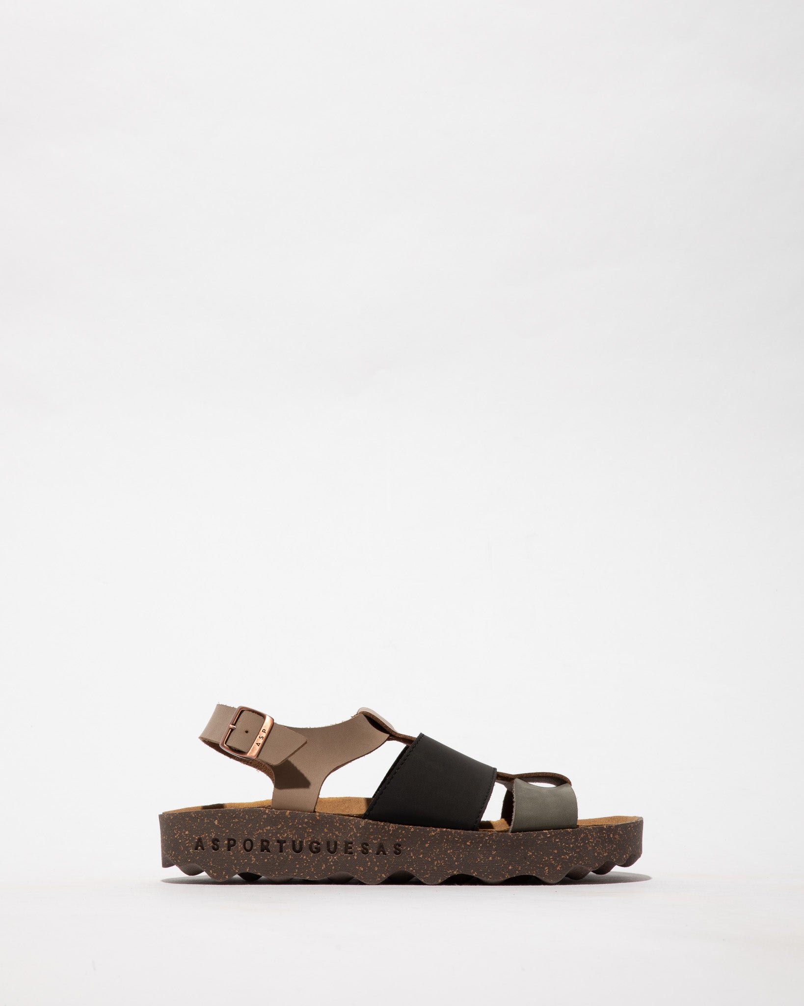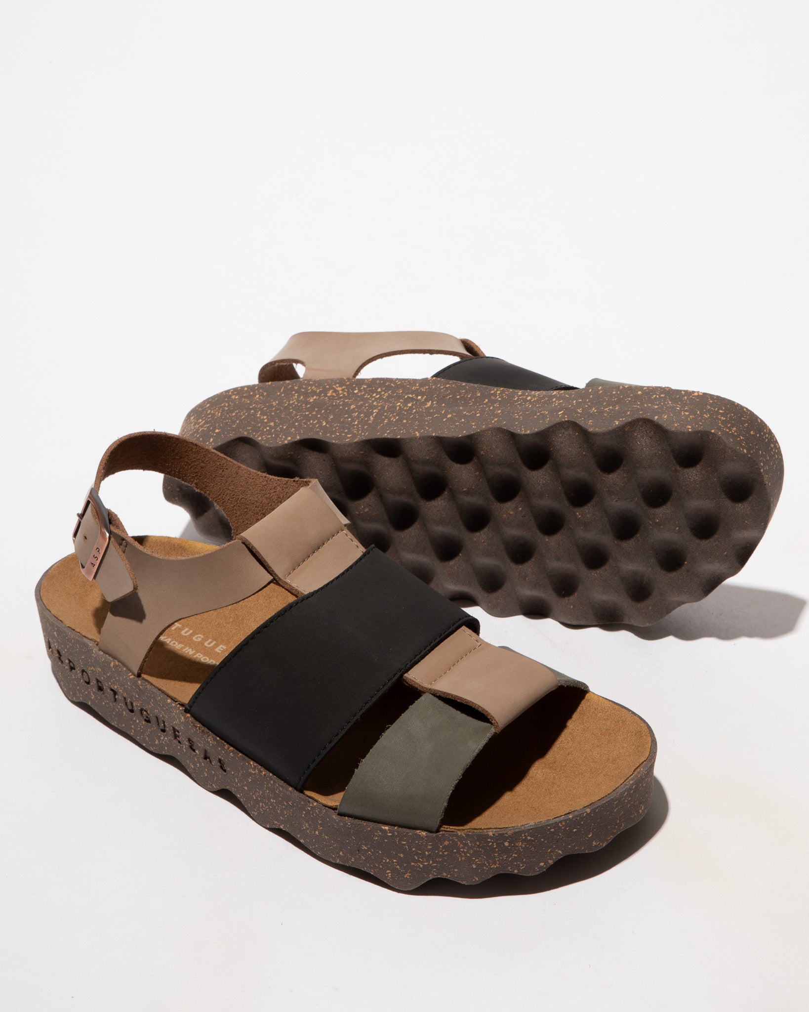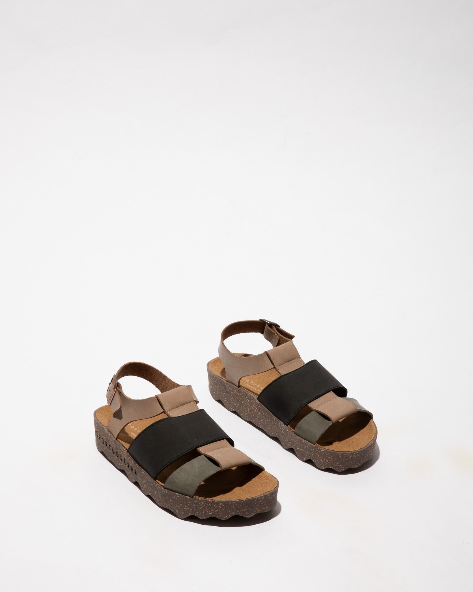 Chinelos de camurça com fivela e plataforna com sola em cortiça.