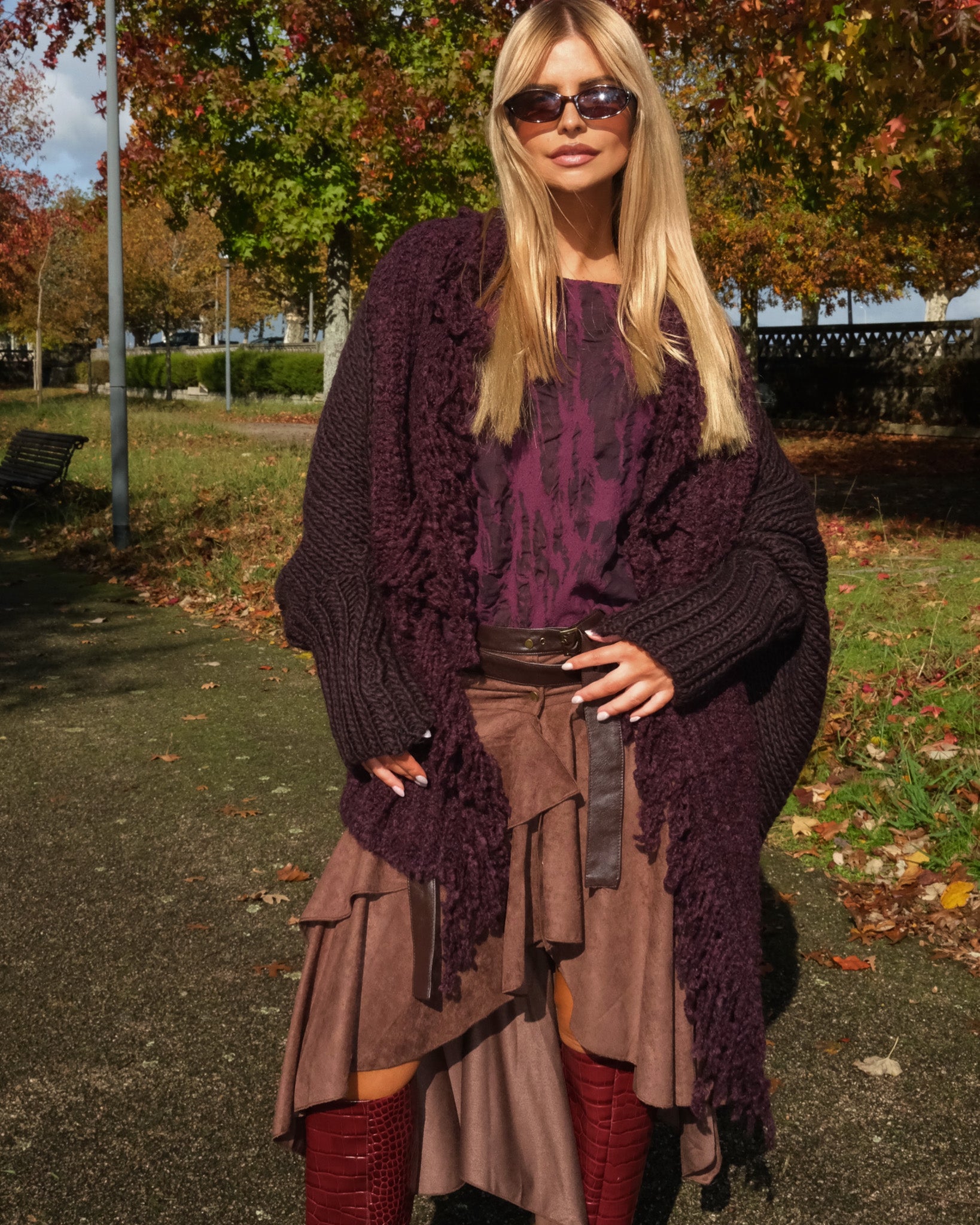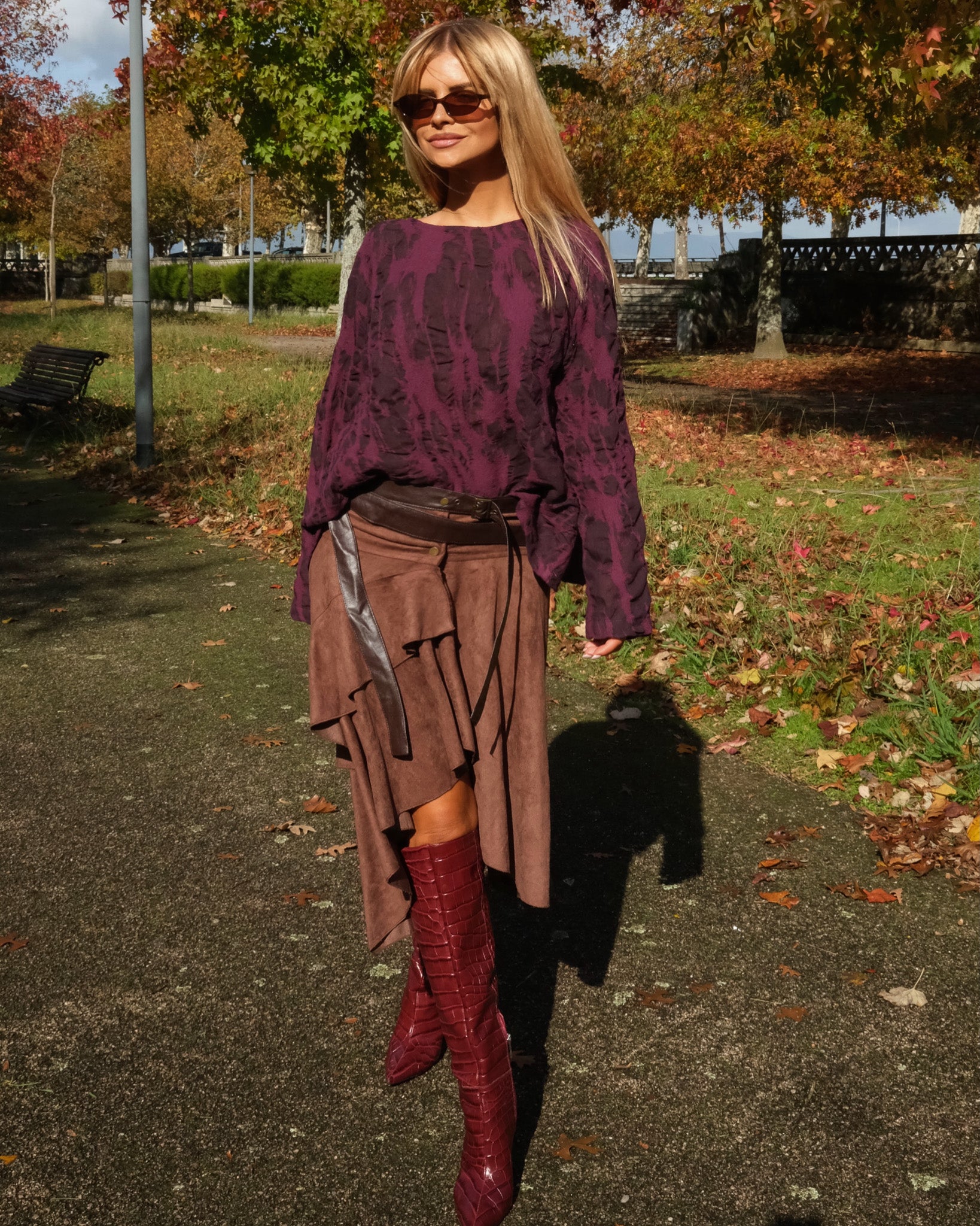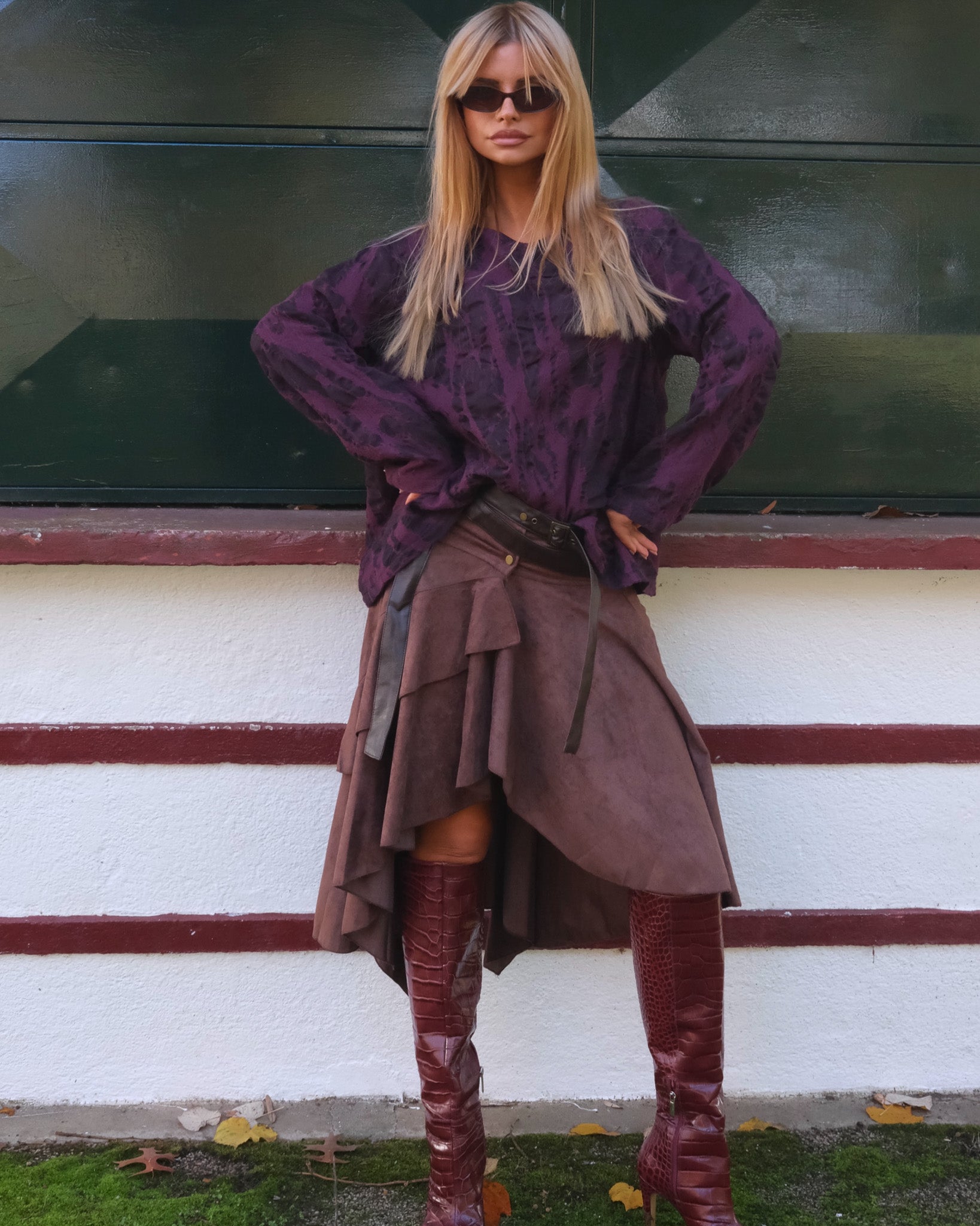 Saia desigual de folhos em pele de pêssego. Contém cinto incorporado em polipele.