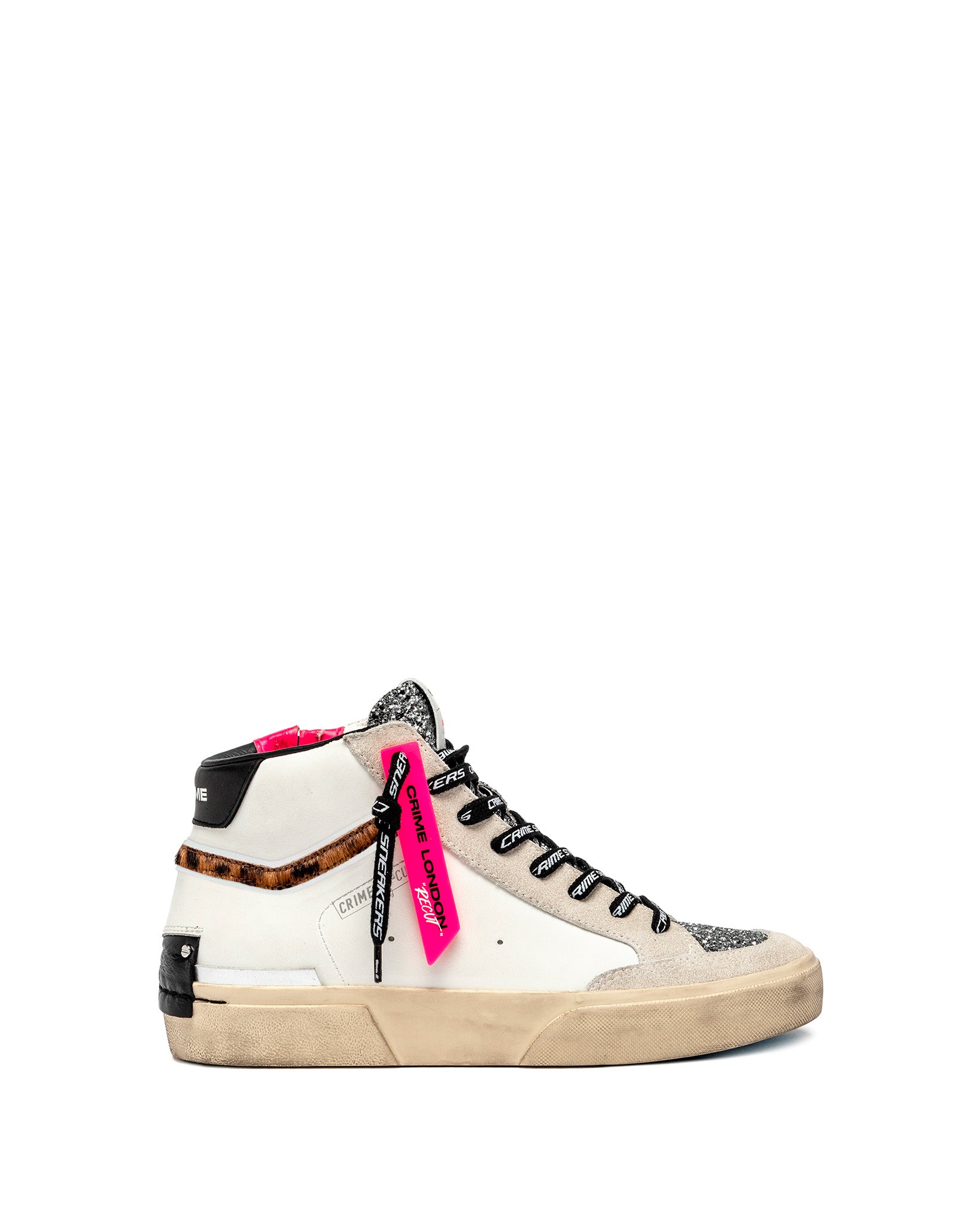 Pele branca como base com detalhes em padrão “cheetah” em tons neutros (bege/castanho) nas laterais e no calcanhar. Remates em pele no calcanhar e nas sobreposições, com costuras visíveis que acentuam o design.